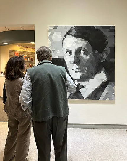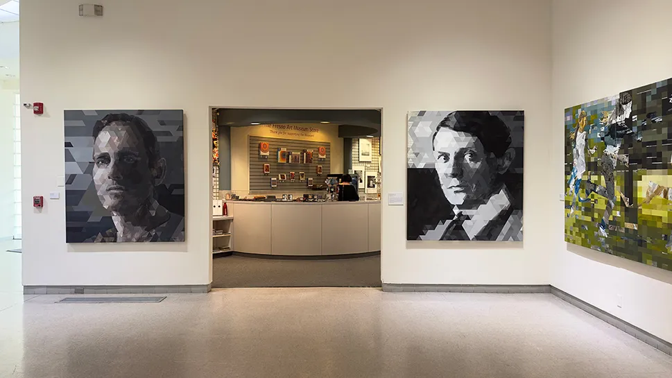 “The works in this exhibition are part of an ongoing body of figurative paintings by artist Michael Azgour (b. 1979, Los Angeles, CA) and his studio which incorporate hard-edge geometric abstractions (or “pixels”) with expressive representational paint application. The resulting images are in flux between that which signifies something else and that which is an end in itself. The viewer is invited to engage with the works and in doing so to take part in completing the work.” – Fresno Art Museum